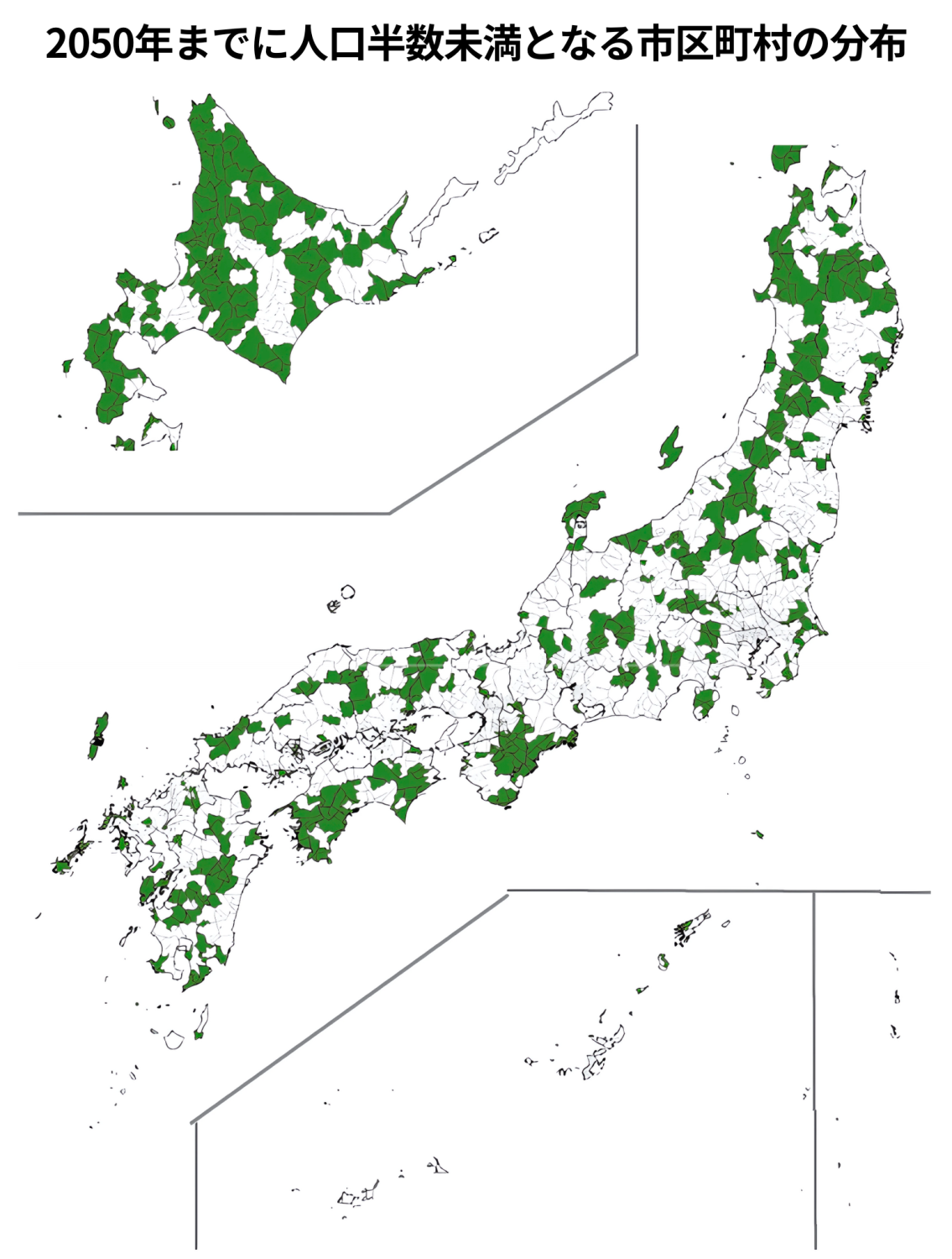 また、市区町村別にみると、全市区町村の約3割にあたる558市町村では、2050年までに人口が半数以下になると考えられています。