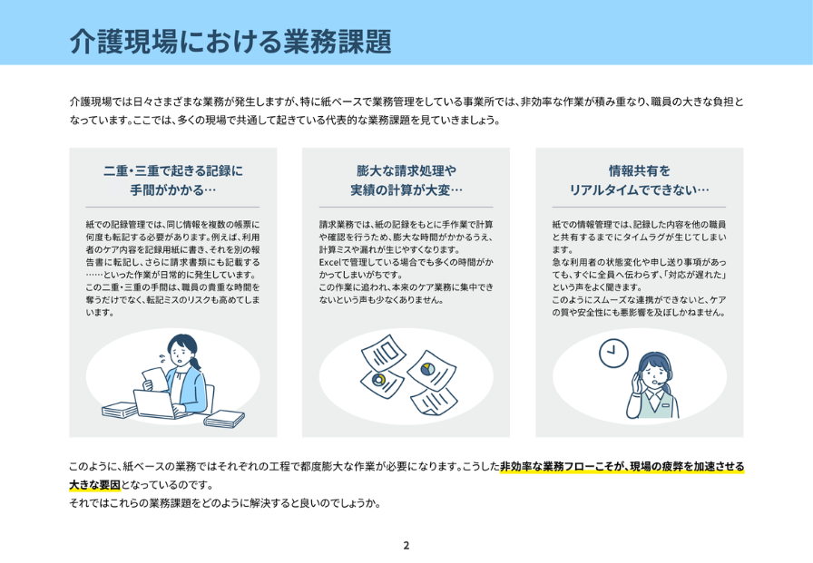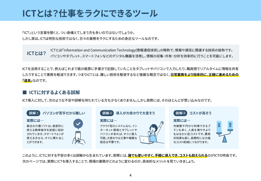 ICT活用ってどう始める?スモールスタートガイド 本お役立ち資料 では、ICTとは何か、導入するとどんなメリットがあるのかを分かりやすくまとめ、現場のさまざまな課題を解決するための ICT活用のポイント を紹介します。 このような方におすすめです! 紙中心の運営から脱却し、ペーパーレス化を進めたい 施設全体で情報共有をスムーズにしたい ICT導入に興味はあるけれど、何から始めていいか分からない サンプルページ
