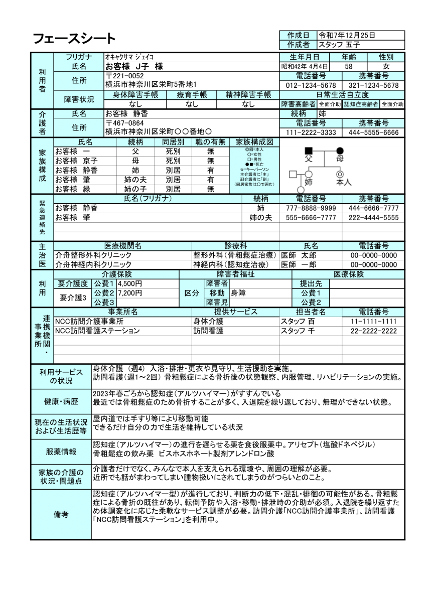 下記は介舟ファミリーが提供しているアセスメントシート(フェースシートとも呼ばれます)です。使い勝手が良いのでぜひダウンロードしてみてください。
