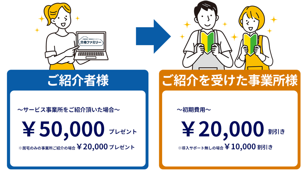 介舟ファミリーをご紹介いただいた事業所様(ご紹介者様)と、 ご紹介を受けて新たにお申込みいただいた事業所様(ご紹介先様)の 双方に特典をご用意しております。